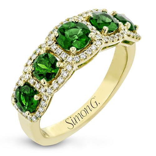 Call For PricingSimon G 18K Yellow Gold Five Stone Emerald Halo Anniversary Ring
